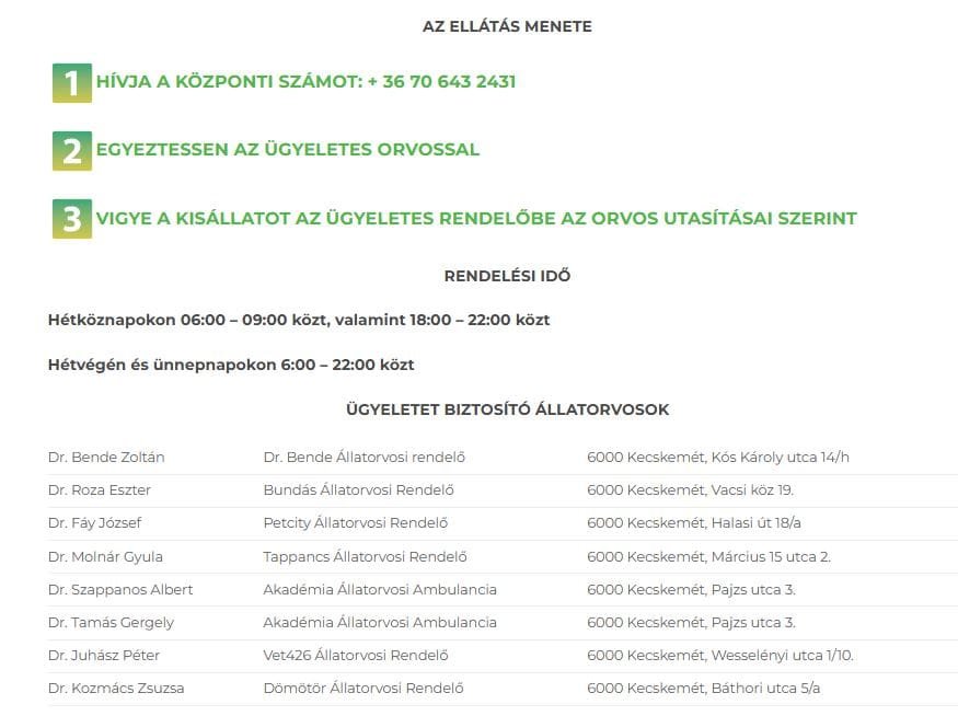 Az ügyeletes állatorvos a telefonos adategyeztetést követően rendelőjében legkésőbb egy órán belül fogadja az ellátásra szoruló állatot.