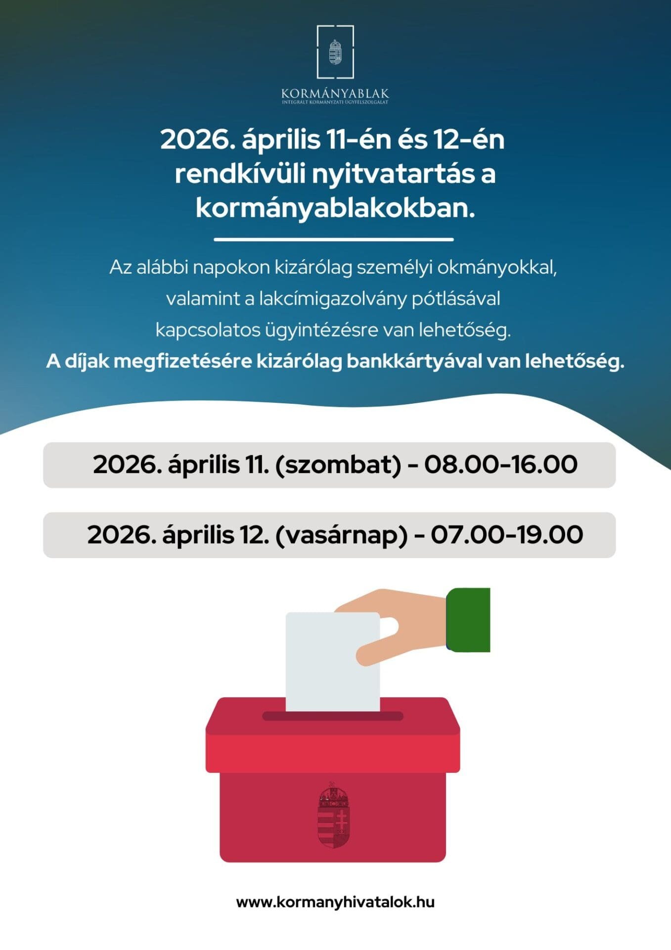 Ezeken a napokon kizárólag személyi okmányokkal kapcsolatos ügyintézésre és a lakcímkártya pótlására lesz lehetőség. Fontos, hogy a felmerülő igazgatási szolgáltatási díjakat kizárólag bankkártyával lehet megfizetni.
