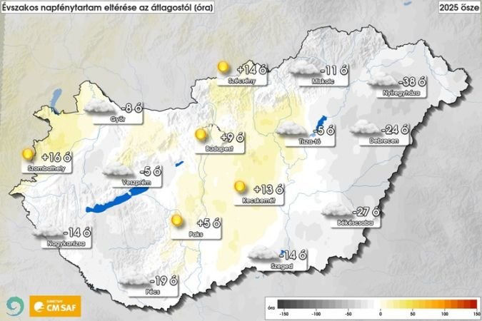 A bejegyzéshez készített infografika szerint idén ősszel Nyíregyházán az átlagosnál 38 órával kevesebbet sütött a nap, Békéscsabán 27, Debrecenben 24, Szegeden 14, Miskolcon 11 órával. A Dunántúlon, Pécsen 19 óra, Nagykanizsán 14 óra az elmaradás. Ugyanakkor Szombathelyen az átlagosnál 16 órával többet sütött a nap ősszel, Szécsényben 14 óra, Kecskeméten 13 óra, Budapesten 9 óra volt a többlet.