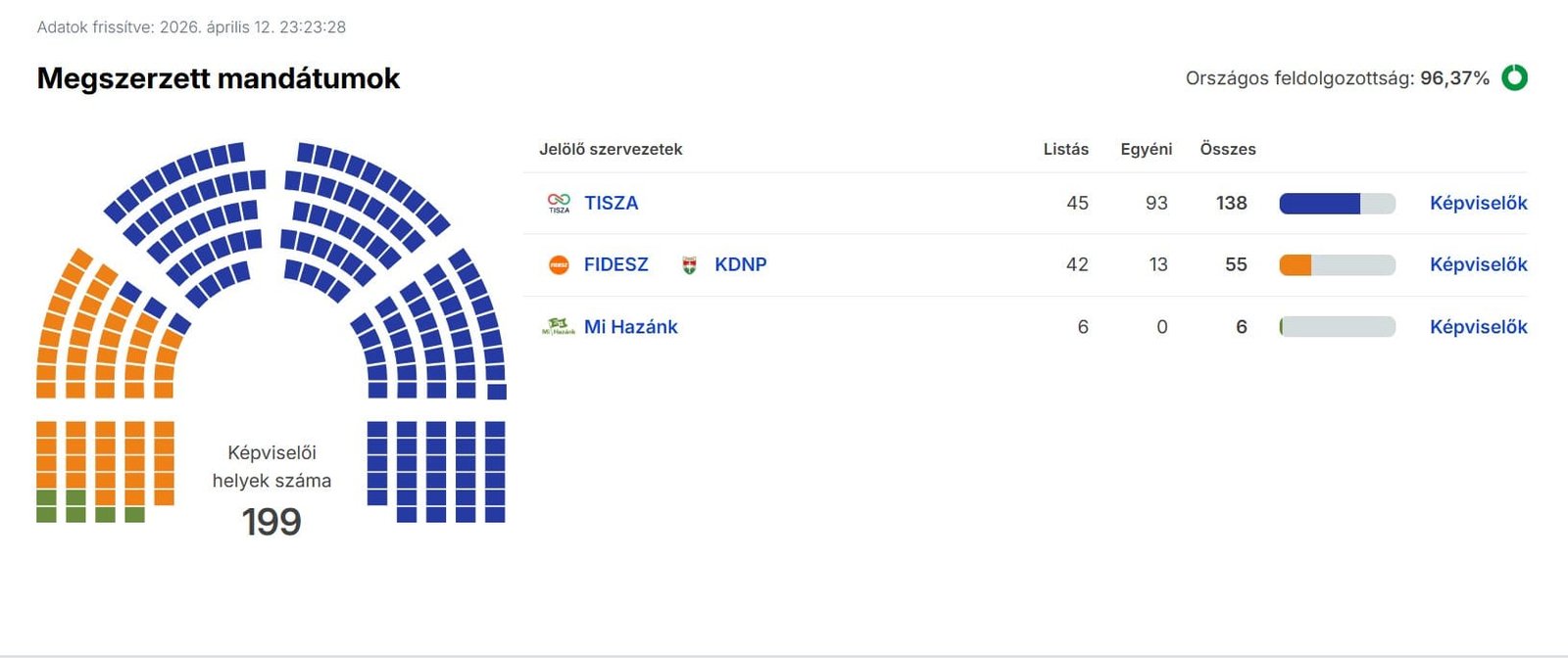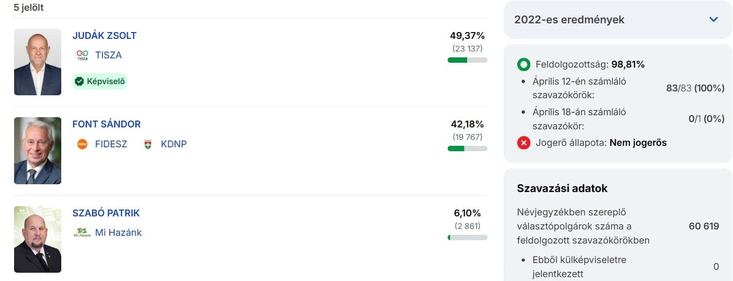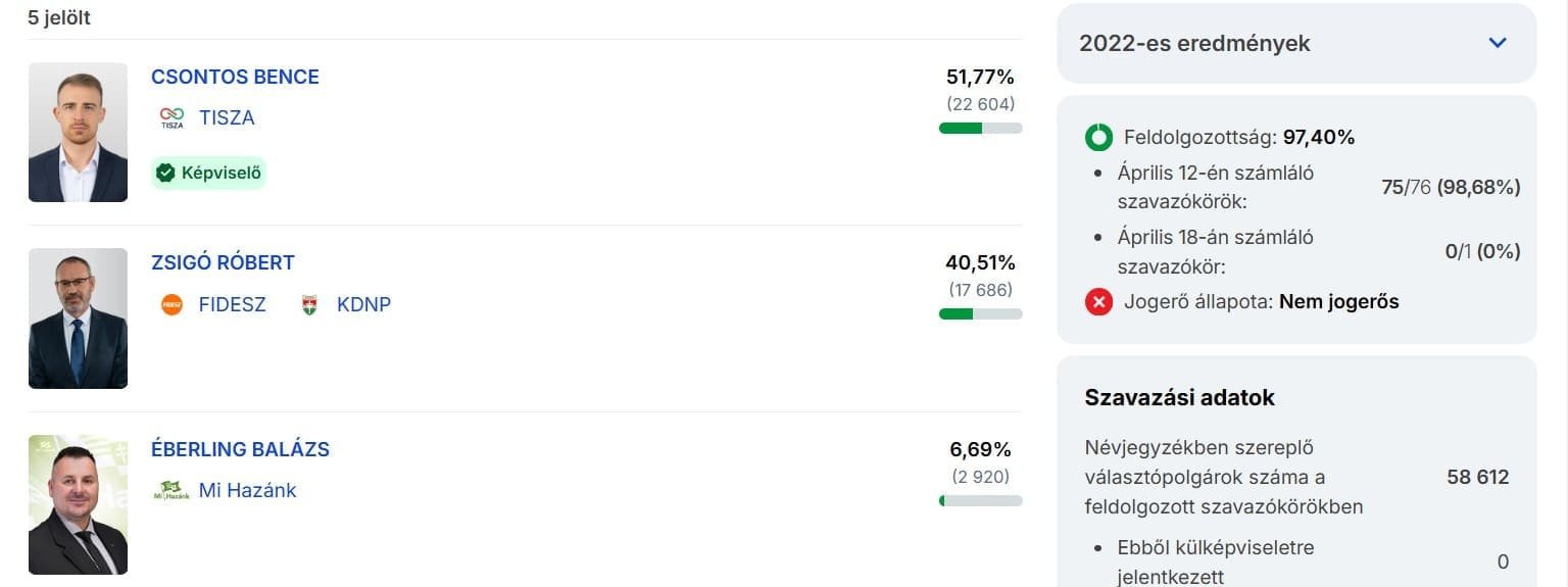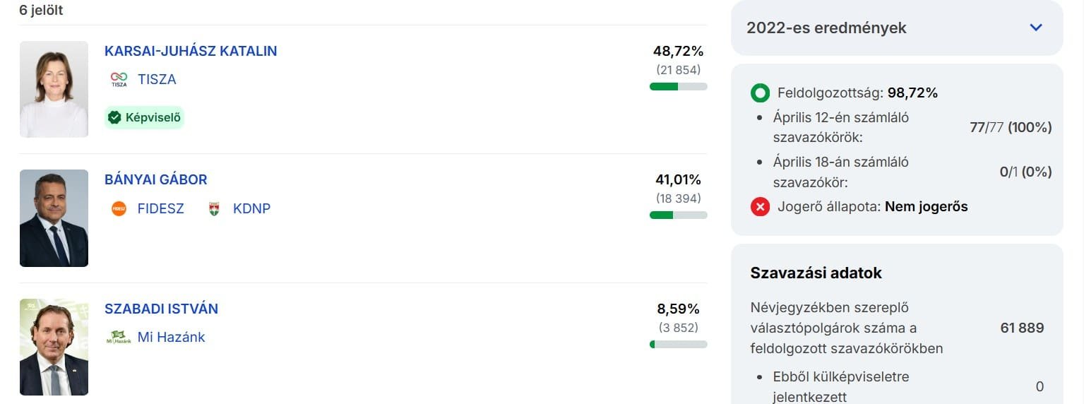 A szavazatok 94,66 százalékának feldolgozása után a Tisza Párt 53,74 százalékon áll. A második helyen a Fidesz–KDNP végezett 37,68 százalékkal, míg a harmadik a Mi Hazánk lett 5,90 százalékkal.