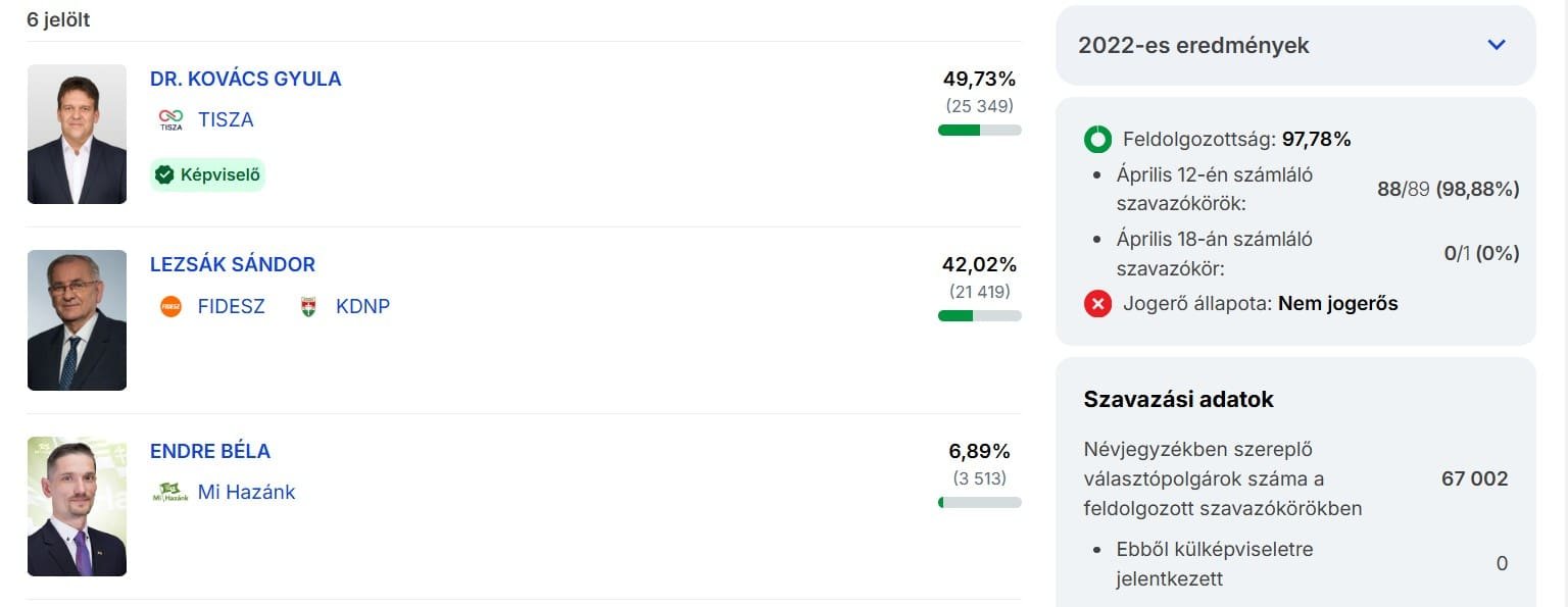 Csőszi Attila 51,38 százalékkal nyert, megelőzve dr. Salacz Lászlót (40,68 százalék) - Bács-Kiskun 02. számú választókerület 95,18%-os feldolgozottság alapján: