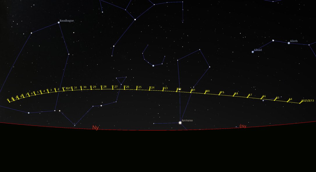 A C/2025 A6 (Lemmon) üstökös helyzete minden nap helyi idő szerint 19 óra 30 perckor (nyári időszámítás szerint) | Forrás: Stellarium