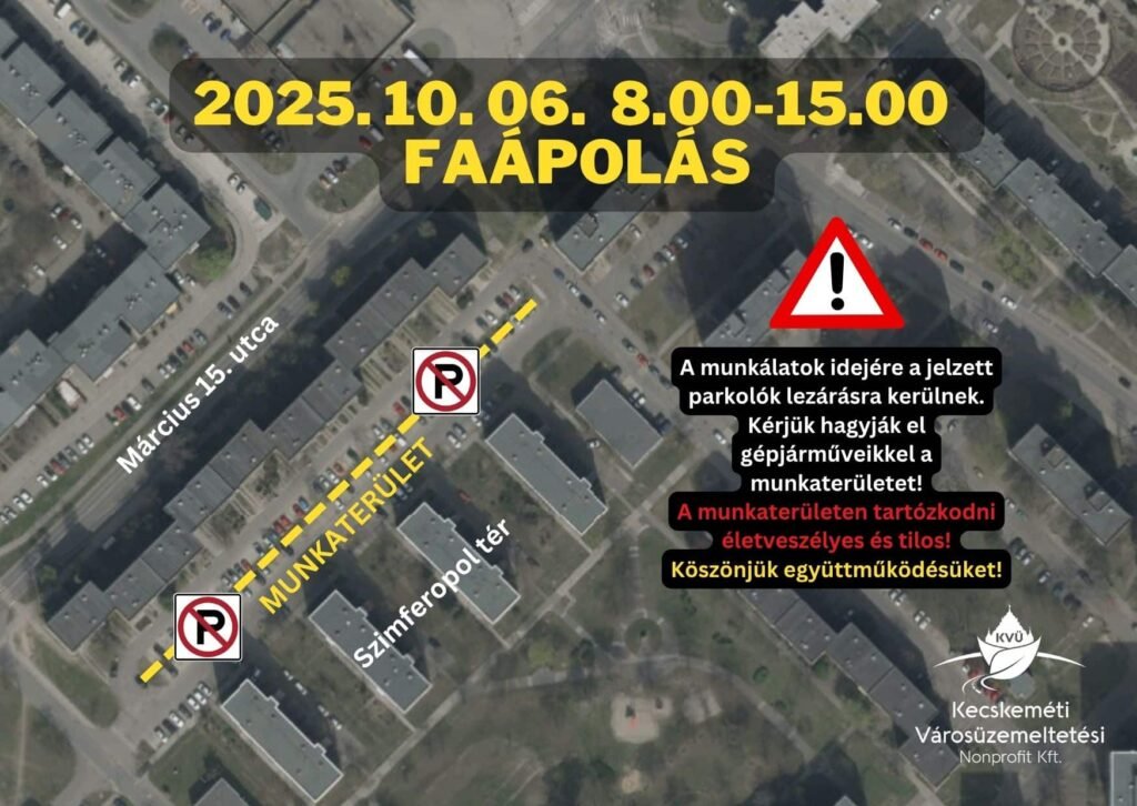 A cég pont az ott lakók járműveinek a megóvása érdekében szeretne az utcában faápolási munkát végezni. De erre nincs lehetőség, mert sok a munkák helyszínén parkoló jármű. A portálunk a napokban tette közzé a hírt, hogy hétfőn, 8.00 és 15.00 óra között faápolási munkát végeznek a Szimferopol tér 1-8. és a Március 15. utca 28-46. közötti parkolónál munkálatok idejére az érintett területet lezárják. A Városüzemeltetési Kft., kérte a lakosokat a gépjárműveikkel hagyják el a parkolókat ma estig! Úgy tűnik, hogy a munkák érdekében kedden is vissza kell térniük a cég munkatársainak a helyszínre, hogy befejezzék a faápolási tevékenységüket.