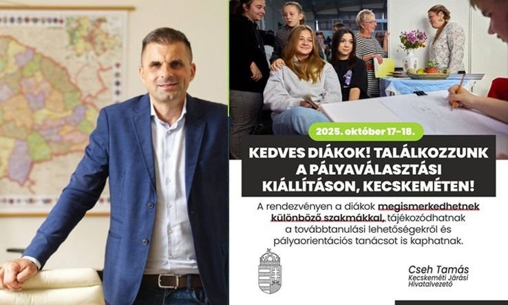 2025. október 17-én pénteken és 18-án szombaton Kecskeméten Pályaválasztási Kiállítás lesz, amelyen az általános iskolás diákok szinte minden szakmába bele tudnak kóstolni. Tájékozódhatnak a továbbtanulási lehetőségekről, megnézhetnek gyakorlati szakmabemutatókat, kipróbálhatnak szakmákat szimulátorokon, és pályaorientációs szakemberektől kérhetnek tanácsot a pályaválasztáshoz – írta közösségi oldalán Cseh Tamás, a Kecskeméti Járási Hivatal vezetője..