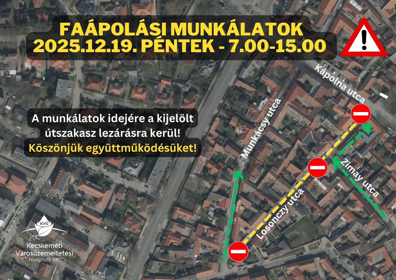 2025. december 19-én pénteken 7.00 és 15.00 óra között faápolási munkát végzünk a Losonczy utcán, amelyet a feladatvégzés idejére lezárunk. A Zimay utca felől érkezők a Kápolna utca felé, a Mária utca felől érkezők a Munkácsy utcán tudnak továbbhaladni. Köszönjük megértésüket, együttműködésüket!