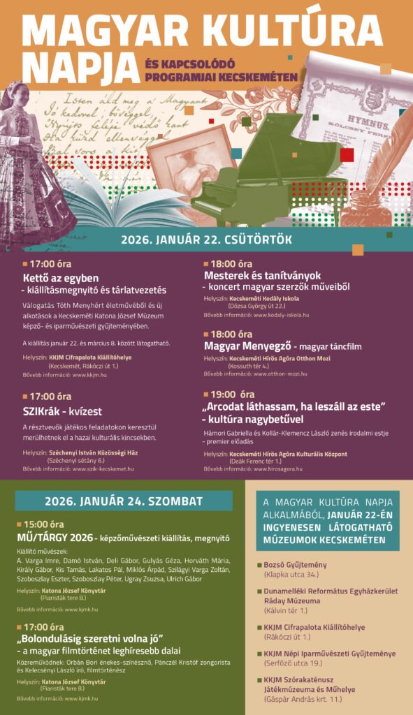 Kecskemét idén is méltó módon ünnepli a Magyar Kultúra Napját: 2026. január 22-én és 24-én változatos programok várják az érdeklődőket a város kulturális intézményeiben. A kínálatban koncertek, kiállításmegnyitók és irodalmi estek is szerepelnek, sőt, január 20. és 31. között számos izgalmas kísérőrendezvény is színesíti az ünnepi időszakot.
