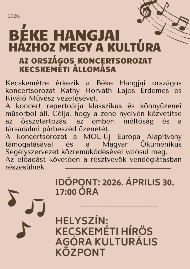 Kecskemétre érkezik a Béke Hangjai országos koncertsorozat Kathy Horváth Lajos Érdemes és Kiváló Művész vezetésével. A koncert repertoárja klasszikus és könnyűzenei műsorból áll. Célja, hogy a zene nyelvén közvetítse az összetartozás, az emberi méltóság és a társadalmi párbeszéd üzenetét.