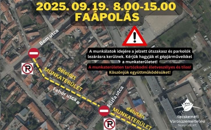 2025. szeptember 19-én pénteken 8.00 és 15.00 óra között faápolási munkát végeznek a Fehér utcában. A munkálatok idejére az utcát ...